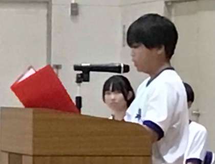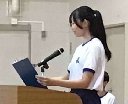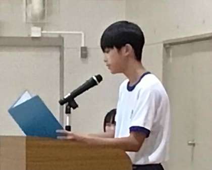 7月18日、夏休み前の全校集会を行いました。各学年の代表生徒から、今までに頑張ったことや学んだこと、夏休みに努力したいことなどが発表されました。話の内容も、全校の前で堂々と話す態度も立派でした。