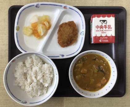 今日の献立は、麦ごはん、夏野菜のカレーライス、梨ポンチ、ヒレカツ、牛乳、でした。 エネルギー:905Kcal