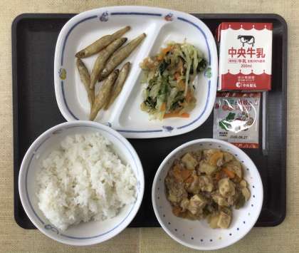 9/19 今日の給食 公開日 2025/09/19 更新日 2025/09/19 各学年から 今日の献立は、ごはん、高野豆腐のうま煮、おひたし、ワカサギの唐揚げ、ふりかけ(野菜と雑穀)、牛乳、でした。エネルギー:787kcal