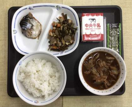 今日の献立は、ごはん、なめこの味噌汁、五目豆、鯖の煮付け、味付け海苔、牛乳、でした。エネルギー:823kcal