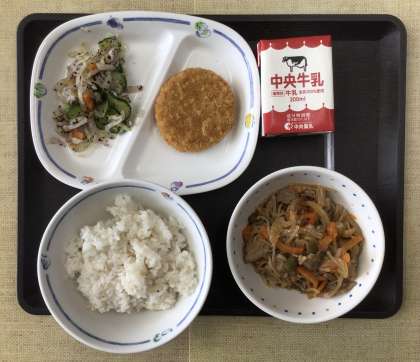 今日の献立は、麦ごはん、豚丼、ゆかり和え、里芋コロッケ、牛乳、でした。エネルギー:845kcal