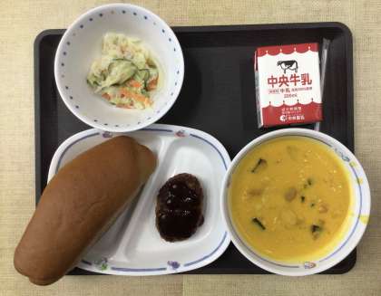 今日の献立は、クロロール、パンプキン・ポタージュ、コールスローサラダ、ハンバーグ(中濃ソース)、牛乳、でした。エネルギー:843kcal