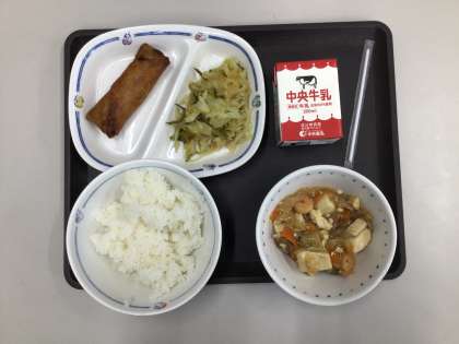 今日の献立は、ごはん、豆腐の中華煮、拌三絲(バンサンスー)、春巻き、牛乳、でした。エネルギー:848kcal