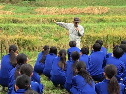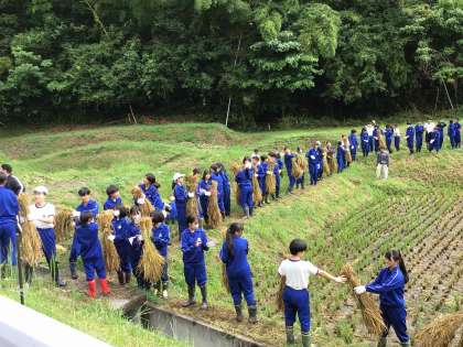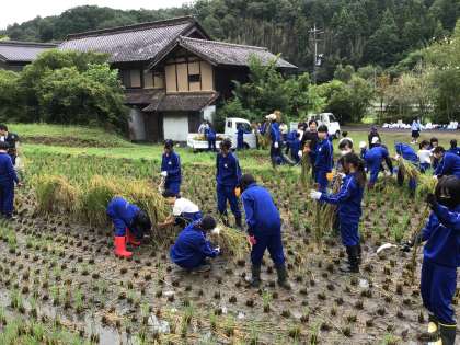 鈴木敏朗さんが前もって準備を進めてくださり、稲刈りが無事に終わりました。米づくり委員会の生徒も、司会進行や後片付けなど、積極的に活躍しました。また、地域学校共働本部の働きかけで、地域にお住いの加藤さん、永井さんに軽トラを出して手伝っていただきました。生徒の頑張りとみなさんの協力のおかげで、予定よりも早く作業を終えることができました。