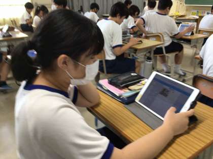 どの教科の授業でも、学習用タブレットを効果的に活用しながら学習を進めています。発表のための資料を作成したり、個別最適な学びができるようデジタル教材に取り組んだりしています。生徒は、便利な文房具の一つとして利用するスキルを身につけています。