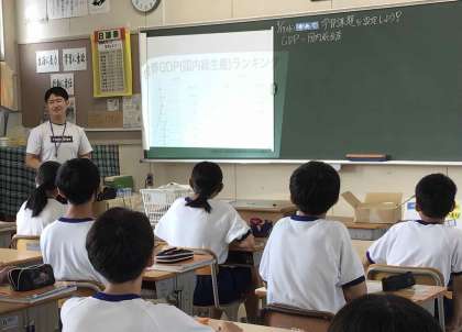 1年生の社会科の学習では、各国のGDPランキングの表から気づいたことを見つけ、疑問に思ったことをもとに学習課題を設定しました。日本のGDPの順位が下がっていることを知った子どもたちは、「ええっ!」と驚きの声を上げていました。