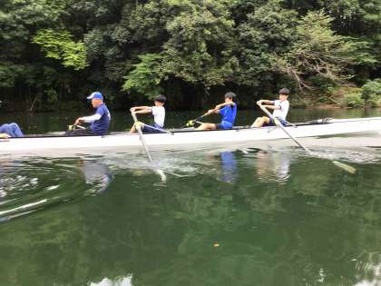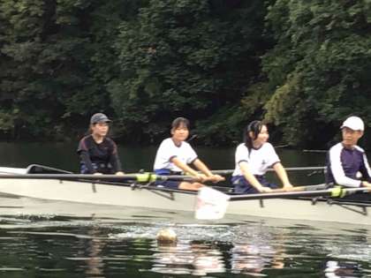 昇竜ローイングクラブのみなさんのご指導によるボート教室の2回目が9月20日に開催されました。少し雨が降りましたが、川にボートを出し、3キロメートルほど漕ぐことができました。2回目の体験の生徒は、レースに出られるレベルだと褒めていただきました。初めて体験した生徒も、あっという間にコツをつかみ、楽しかったと感想を話していました。