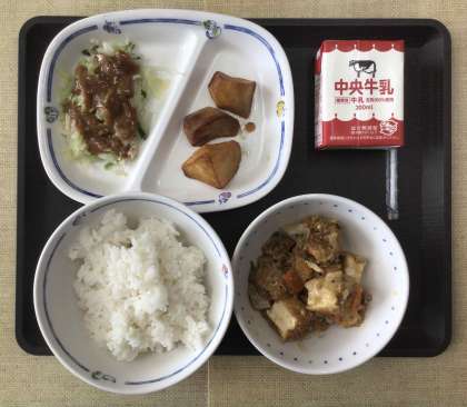 10/6 今日の給食 公開日 2025/10/06 更新日 2025/10/06 各学年から 今日の献立は、ごはん、ピリッと厚揚げ、棒々鶏(棒々鶏ソース)、大学芋、牛乳、でした。エネルギー:857kcal