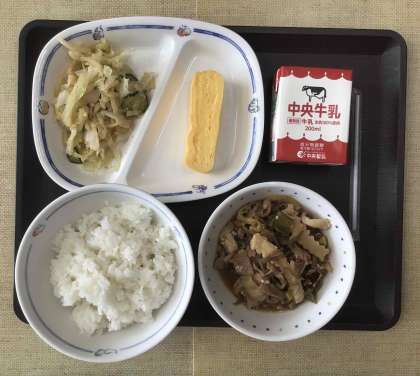 今日の献立は、ごはん、すき焼き風煮、ゴマ酢和え、厚焼き玉子、牛乳、でした。エネルギー:789kcal