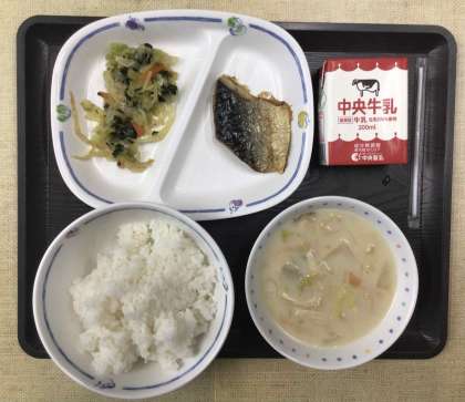 今日の献立は、「たべまるのおすすめメニュー」で、ごはん、豆乳のバランス味噌汁、おひたし、鯖の塩焼き、牛乳、でした。エネルギー:803kcal