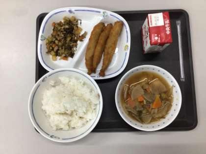 今日の献立は、ごはん、米粉団子汁、糸切り昆布の炒め煮、シシャモフライ、牛乳、でした。エネルギー:851kcal