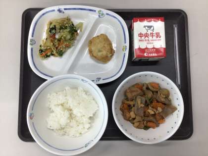 今日の献立は、ごはん、いり鶏、アーモンド和え、豆腐しんじょ、牛乳、でした。エネルギー:799kcal