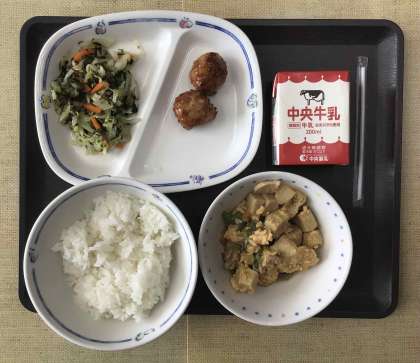 10/23 今日の給食 公開日 2025/10/23 更新日 2025/10/23 各学年から 今日の献立は、ごはん、高野豆腐の玉子とじ、磯香和え、愛知県産食材入り肉団子、牛乳、でした。エネルギー:785kcal