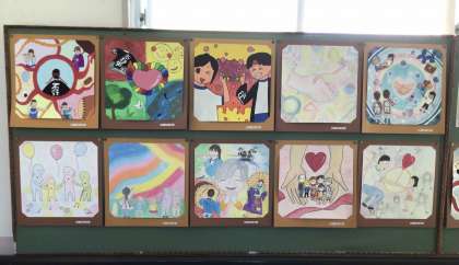 夏休み中に生徒が取り組んだ「ふれあいまつり」ポスターの力作が掲示されています。テーマ「つながる心、広がる笑顔」を意識した温かみのある作品です。代表作品はポスターにして地域に回覧したり掲示したりする予定です。