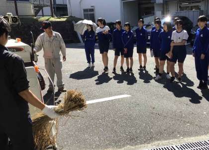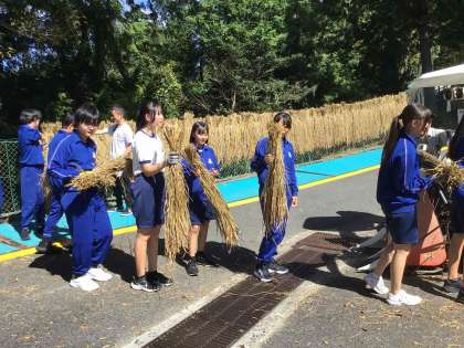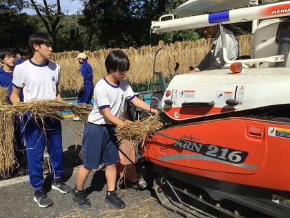 今後の天気が心配されたため、当初は30日に実施する予定であった脱穀を26日に実施しました。鈴木敏朗さんの指導のもと、3年生が手際よく作業を進めました。