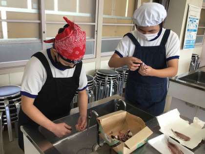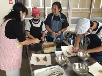 3組では、イワシを背開きして蒲焼きにすると同時に、ごはんを炊く調理実習を行いました。日頃の学習の成果もあり、イワシをきれいに手開きしたり、お米を研いで炊飯器にセットしたりすることができました。