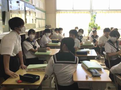 総合的な学習で学んだ内容を生かし、考えを広げたり深めたりするために話し合う力を身に付ける学習に取り組んでいます。多様な意見に触れるため、この学習単元は2クラス一緒にチームティーチングで実施します。生徒は、いろんな考え方があることに気づきはじめ、話し合っていきたいという意欲を高めていました。