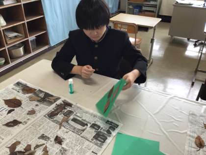 特別支援学級3組の理科で、秋の落ち葉を使った「しおり」づくりをしています。