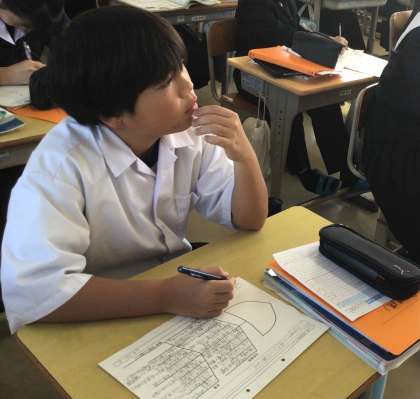 1年生の社会科の学習では、世界の国々の課題について知り、解決方法を考えています。フィッシュボーンという思考ツールを使い、アフリカの課題について自分の考えをまとめたり、級友の意見から学んだりしました。