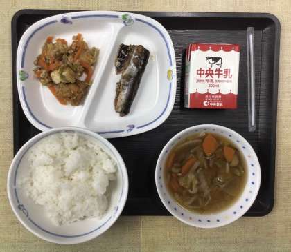 今日の献立は、ご飯、米粉団子汁、生揚げチャンプルー、鰯の梅煮、牛乳、でした。エネルギー:790Kcal