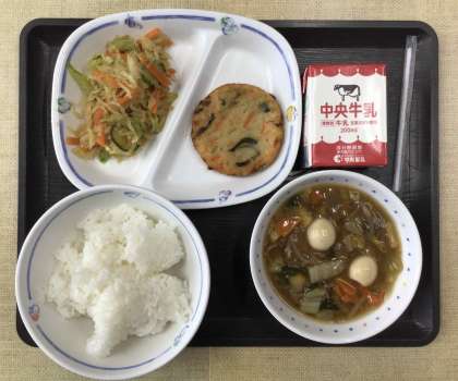 今日の献立は、「日本型食生活週間メニュー」で、ご飯、八宝菜、中華和え、チヂミ、牛乳、でした。エネルギー:833Kcal