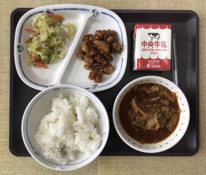 今日の献立は、「日本型食生活週間メニュー」で、ご飯、キムチ入り味噌汁、昆布和え、レバーと大豆のゴマがらめ、牛乳、でした。エネルギー:815Kcal