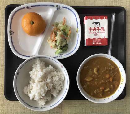 今日の献立は、「日本型食生活週間メニュー」で、麦ご飯、カレーライス、チキンサラダ、ミカン(生)、牛乳、でした。エネルギー:890Kcal