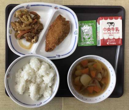 11/28 今日の給食 公開日 2025/11/28 更新日 2025/11/28 各学年から 今日の献立は、ご飯、いものこ汁、生揚げとキャベツの味噌炒め、鮭フライ、抹茶ふりかけ、牛乳、でした。エネルギー:790Kcal