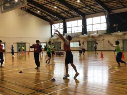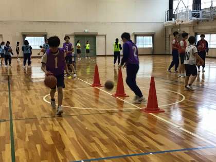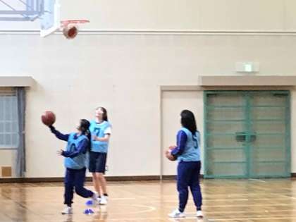 3年生は体育の授業でバスケットボールに取り組んでいます。シュート、ドリブル、パスなど、オフェンスに必要な練習に楽しそうに取り組んでいました。