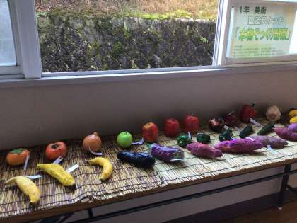 美術の授業で作製した、本物そっくりの野菜が展示されています。自宅に持ち帰って台所に置いたら、本物と見分けがつかないだろうな、と感じる出来栄えです。