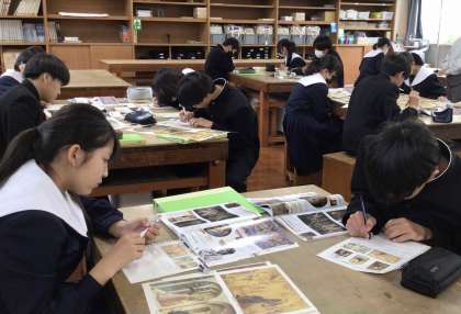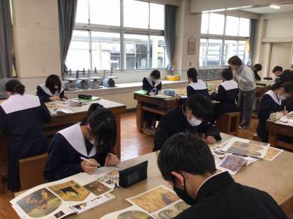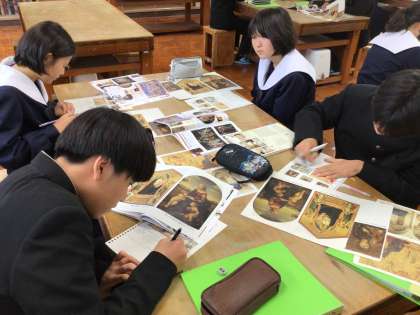1年生の美術では、鑑賞の学習に取り組んでいます。中世とルネサンス期を比べながら、それぞれの時代の特徴を見つけました。鑑賞する観点をもち、真剣に作品に見入る生徒の眼差しがありました。