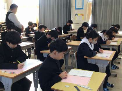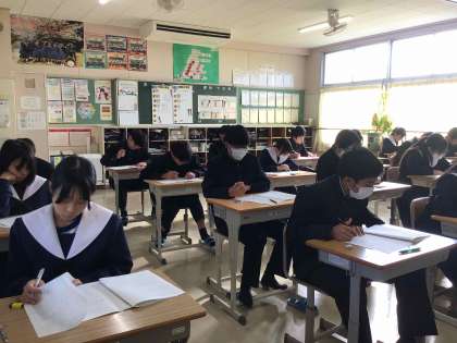 全校そろって定期テストに取り組んでいます。どの教室にも、真剣にテストに向かう生徒の姿があります。