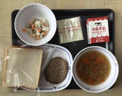 今日の献立は、スライスパン、オニオンスープ、ビーンズマセドアン、チーズハンバーグサンド(ハンバーグ・スライスチーズ)、牛乳、でした。エネルギー:813kcal