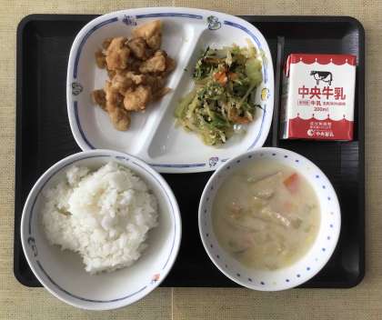 12/5 今日の給食 公開日 2025/12/05 更新日 2025/12/05 各学年から 今日の献立は、ご飯、豆乳のバランス味噌汁、アーモンド和え、鶏肉のおろしソースかけ、牛乳、でした。エネルギー:809kcal