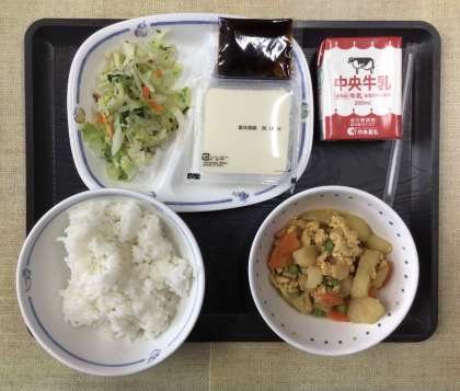 今日の献立は、ご飯、親子煮、青菜和え、湯豆腐・味噌たれ、牛乳、でした。エネルギー:807kcal
