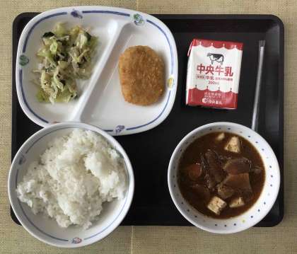 今日の献立は、「豊田ブランドの日メニュー」で、ご飯(ミネアサヒ)、豚汁、タマネギドレッシングの和風サラダ、豊田産ジャガイモコロッケ、牛乳、でした。エネルギー:799kcal
