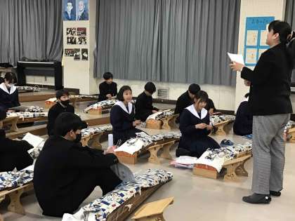 音楽の授業では、和楽器の特徴を感じ取って魅力を味わう学習に取り組んでいます。箏を演奏するために、少し正座をしてみた1年生ですが、短時間でも正座が難しい様子でした。