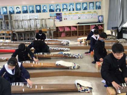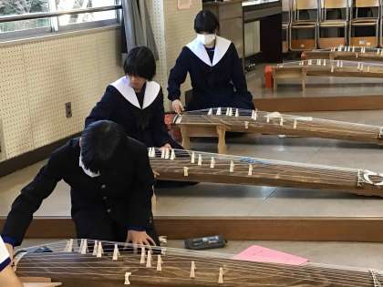 2年生の音楽では、箏の音色の調整が自分でできるように挑戦しています。集中して音を聞き、教師や友達と確認しながら調整をしていました。