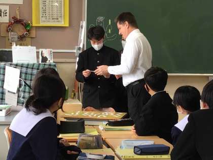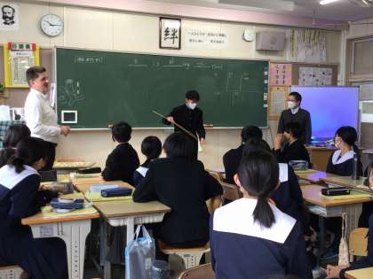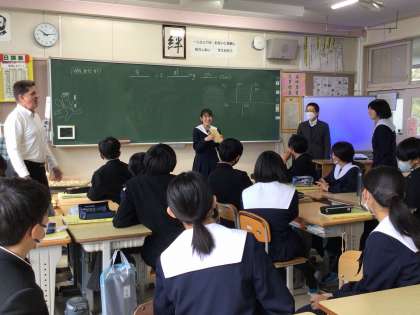 1年生の英語では、現在進行形を学んでいます。ALTと一緒に、ジェスチャーゲームをしながら現在進行形の表現について理解を深めました。