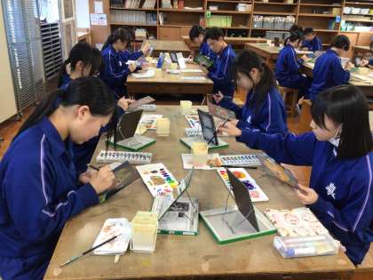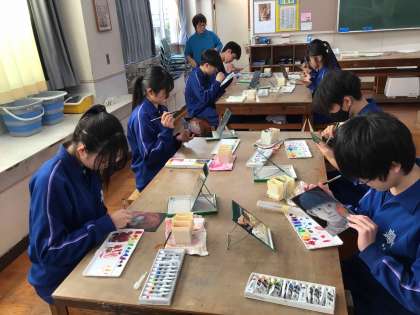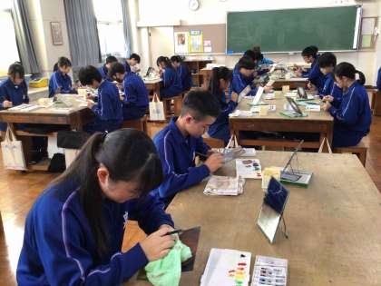 3年生の美術の授業では、仕上がり具合を確認しながら、どの子も黙々と作品に着色していました。特徴をよくとらえた自画像が間もなく完成します。