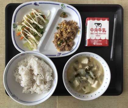 今日の献立は、「たべまるのおすすめメニュー」で、麦ご飯、豆腐とワカメの味噌汁、レンコンサラダ(マヨネーズ風ドレッシング)、ツナそぼろ丼、牛乳、でした。エネルギー:811kcal