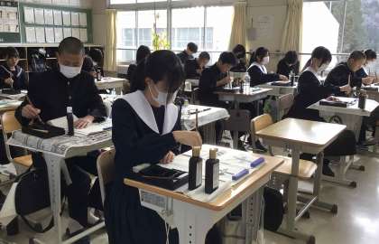 新年最初の登校日、生徒は習字道具を持って元気に教室に入りました。1、2時間目は書き初めです。どの教室も、課題の意味を考えながら、集中して取り組む生徒の姿がありました。