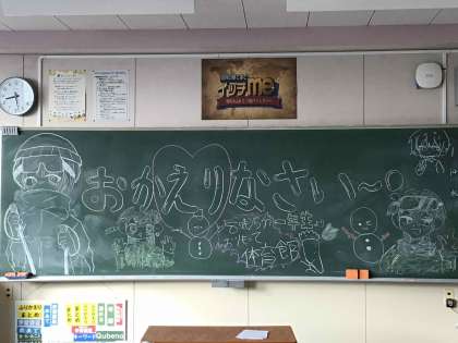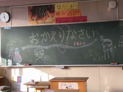 全員が元気に参加した自然教室を終えて、2年生が学校に戻ってきました。教室には、1年生が準備した黒板メッセージが待っていました。通常の授業、日常生活に戻りましたが、自然教室で学んだことを生かしてほしいと期待しています。