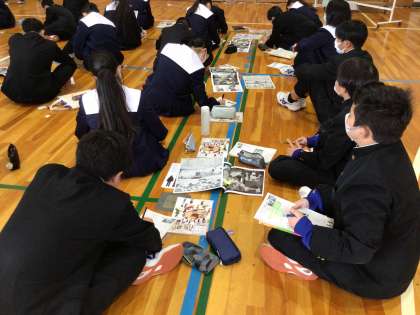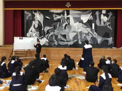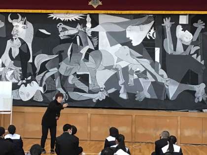 2年生の美術の授業では、ゲルニカを題材に鑑賞しました。実物大の教材を体育館で見ながら、描かれている物や描かれ方の意味を深く考え、伝え合いました。実物大だからこそ感じられる絵の力に、心が揺さぶられる時間となりました。