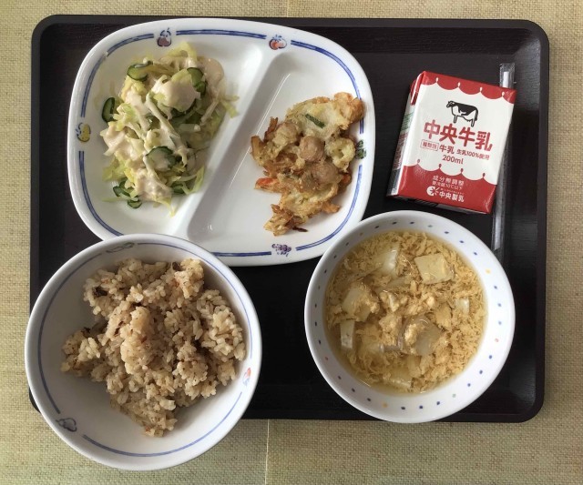 今日の献立は「たべまるのおすすめメニュー」で、三河赤鶏五目ご飯、かきたま汁、和風サラダ(和風ドレッシング)、わんぱくジャコ天、牛乳、でした。エネルギー:830kcal