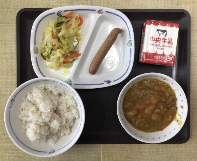 今日の献立は、麦ご飯、カレーライス、サワーキャベツ、ウインナー、牛乳、でした。エネルギー:864kcal