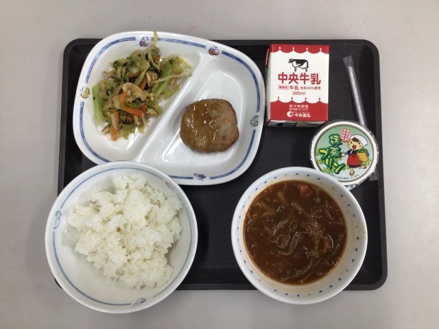 今日の献立は「豊田ブランドの日メニュー」で、ご飯、キムチ入り味噌汁、ごま和え、とよたひまわりポークハンバーグの照り焼きソースかけ、抹茶プリン、牛乳、でした。エネルギー:789kcal