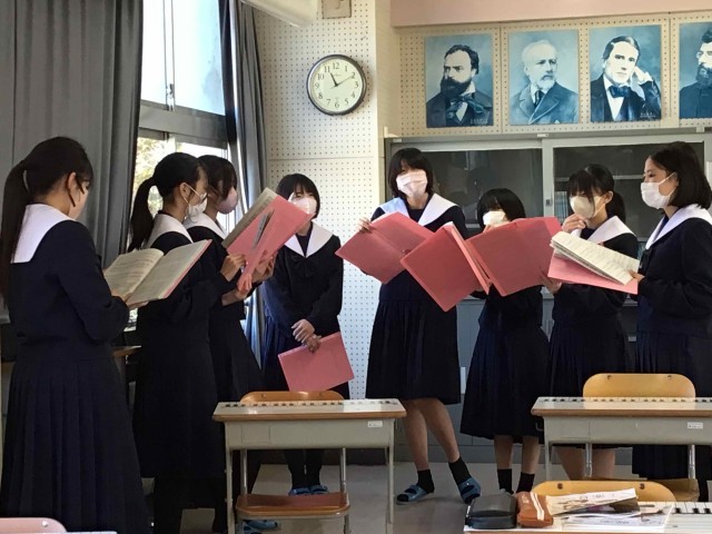 1年生の音楽では、卒業生を祝う会で3年生に贈る合唱の練習に取り組んでいます。インフルエンザの予防のためにマスクをして、楽譜に気づいたことを書き込みながら練習しています。