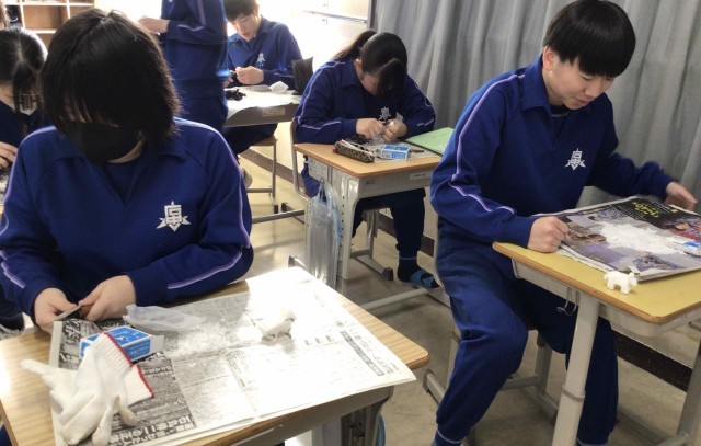 3年生の技術科の授業では、小刀を使って石鹸を削り、動物などの形を作っています。なかなか上手にできた!と作品を見せてくれる生徒の笑顔が素敵でした。