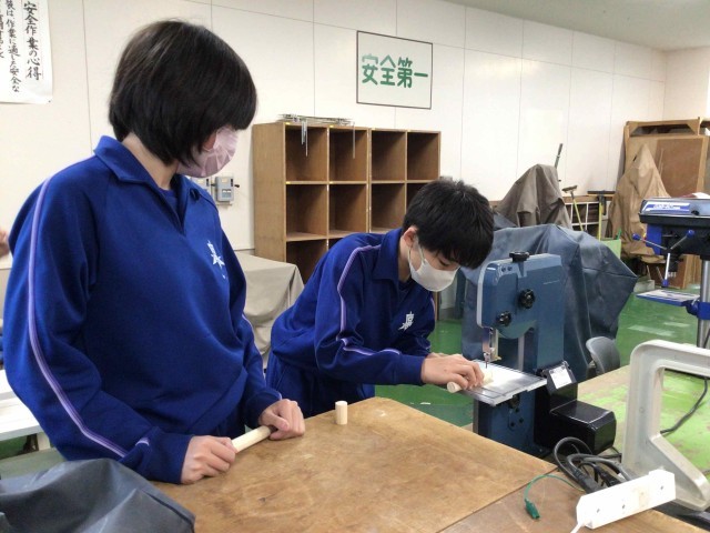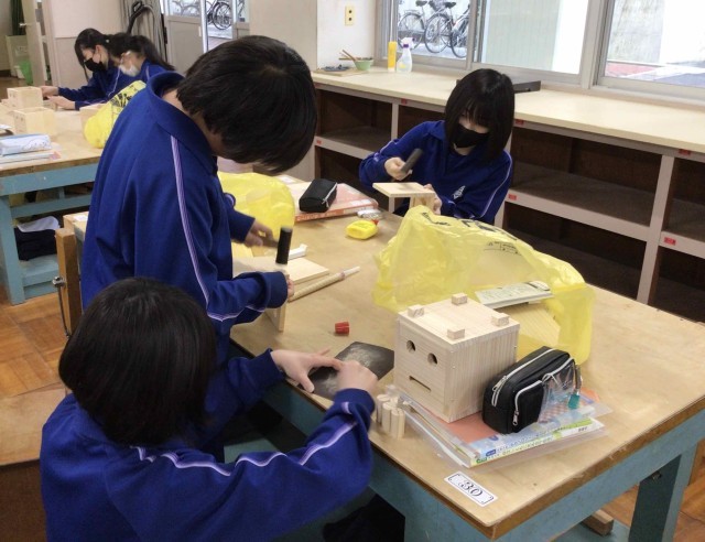 1年生の技術で製作しているニコちゃんボックスが完成に近づいてきました。足の高さがそろうように慎重に作業を進めていました。